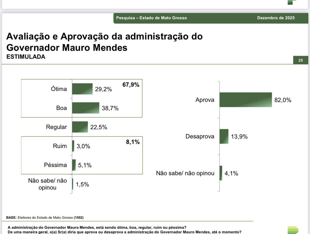 A pesquisa divulgada hoje mostrou que apenas 13,9% desaprovam o governo Mauro Mendes, enquanto 4,1% não souberam responder ou preferiram não opinar.