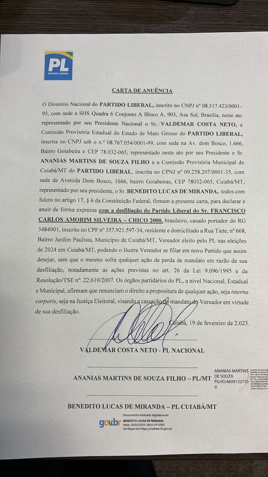 Conteúdo/ODOC - Afastado do mandato pela segunda vez em decorrência da Operação Gorjeta, deflagrada nesta terça-feira (27), o vereador Chico 2000 já não integra o Partido Liberal (PL). A saída da sigla foi formalizada por meio de carta de anuência assinada em 19 de fevereiro de 2025 pelo presidente nacional do PL, Valdemar Costa Neto, e pelo presidente estadual do partido em Mato Grosso, Ananias Martins de Souza Filho.