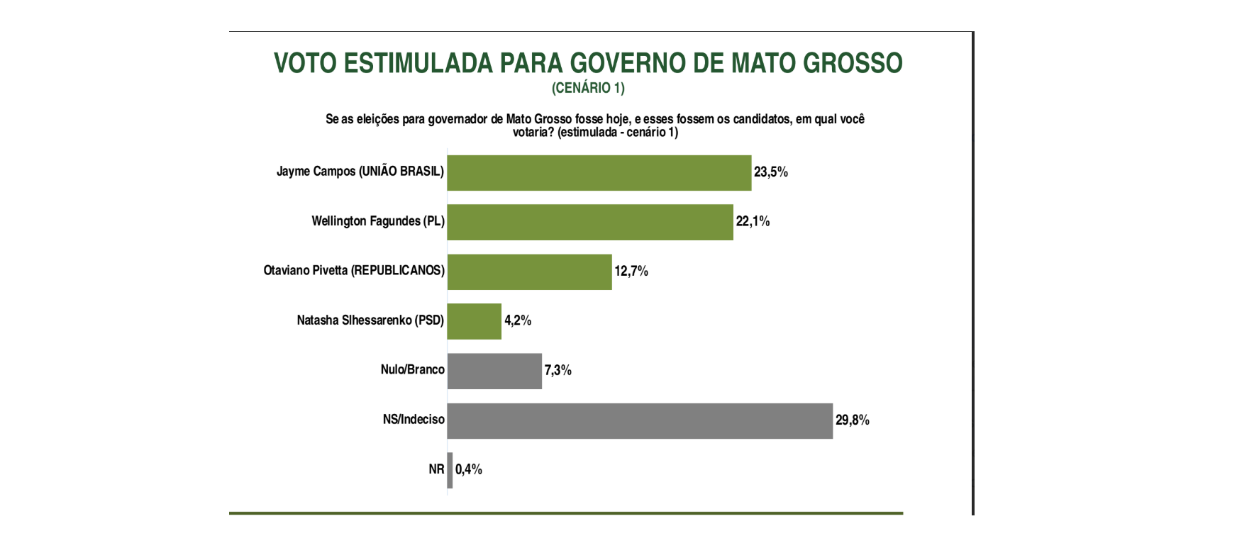 Os números mostram disputa acirrada nas duas maiores cidades de Mato Grosso. Pelo levantamento, no primeiro cenário, Jayme tem 23,5% das intenções de votos. Muito próximo, com 22,1%, apareceu o senador liberal, candidato declarado ao Palácio Paiaguas, em 2026. O vice-governador, Otaviano Pivetta (Republicanos), cravou 12,7% de preferência, seguido pela médica, Natasha Slhessarenko (PSD), com 4,2%.