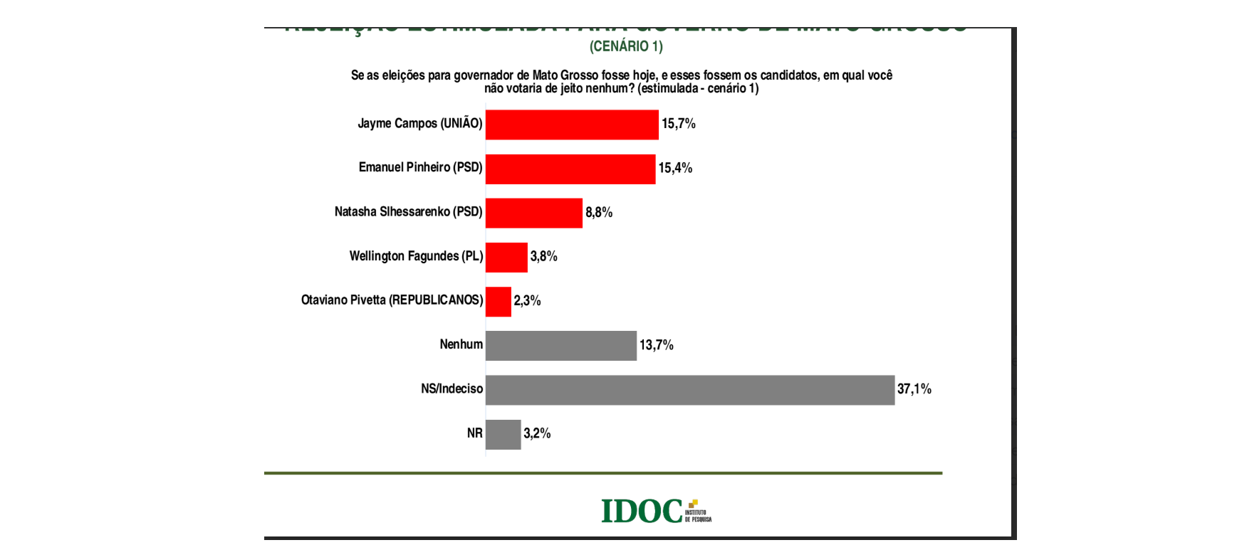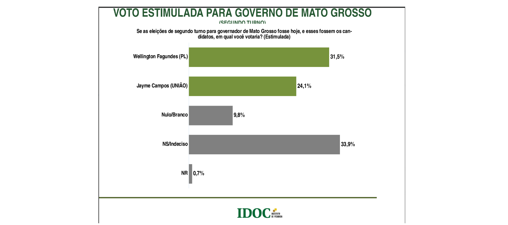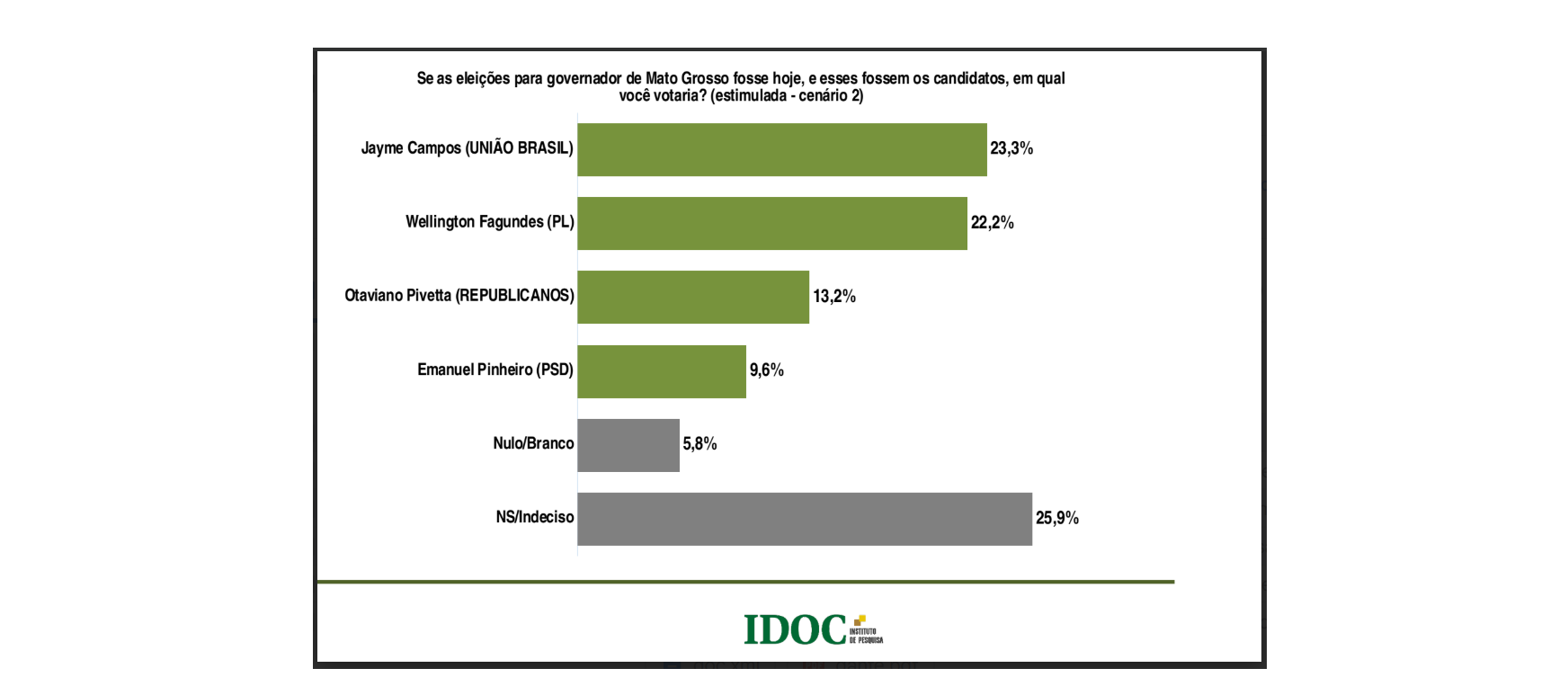 Levantamento realizado pelo Instituto IDOC, empresa ligada ao Portal O Documento e TV Cuiabá, aponta cenário de empate técnico entre os senadores, Jayme Campos (União Brasil) e Wellington Fagundes (PL), em eventual disputa ao Governo do Estado. A sondagem presencial ouviu 1.000 entrevistados em Várzea Grande e Cuiabá nos dias 29 e 30 de novembro, e 1º de dezembro.