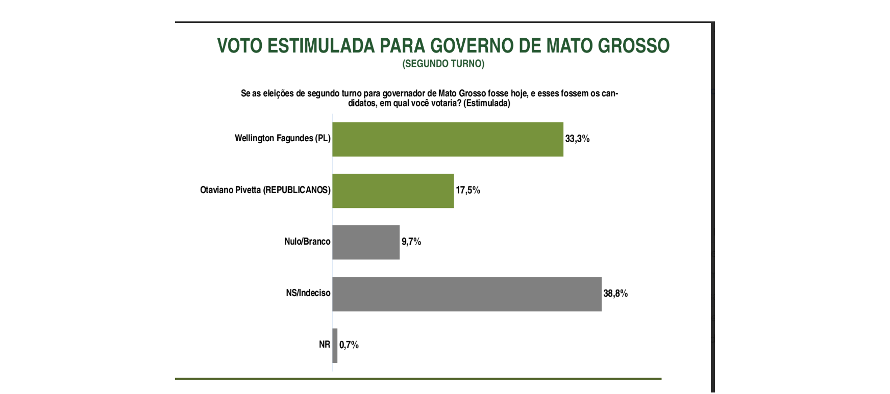 Num embate direto com Jayme, Fagundes está em primeiro com 31,5%. Campos teve 24,1% das citações, o que também se aproxima de um empate técnico, uma vez que a pesquisa tem margem de erro de 4% para mais ou para menos. Já contra o atual vice-governador, Otaviano Pivetta, o senador do PL ampliou a vantagem: 33,3% a 17,5%.
