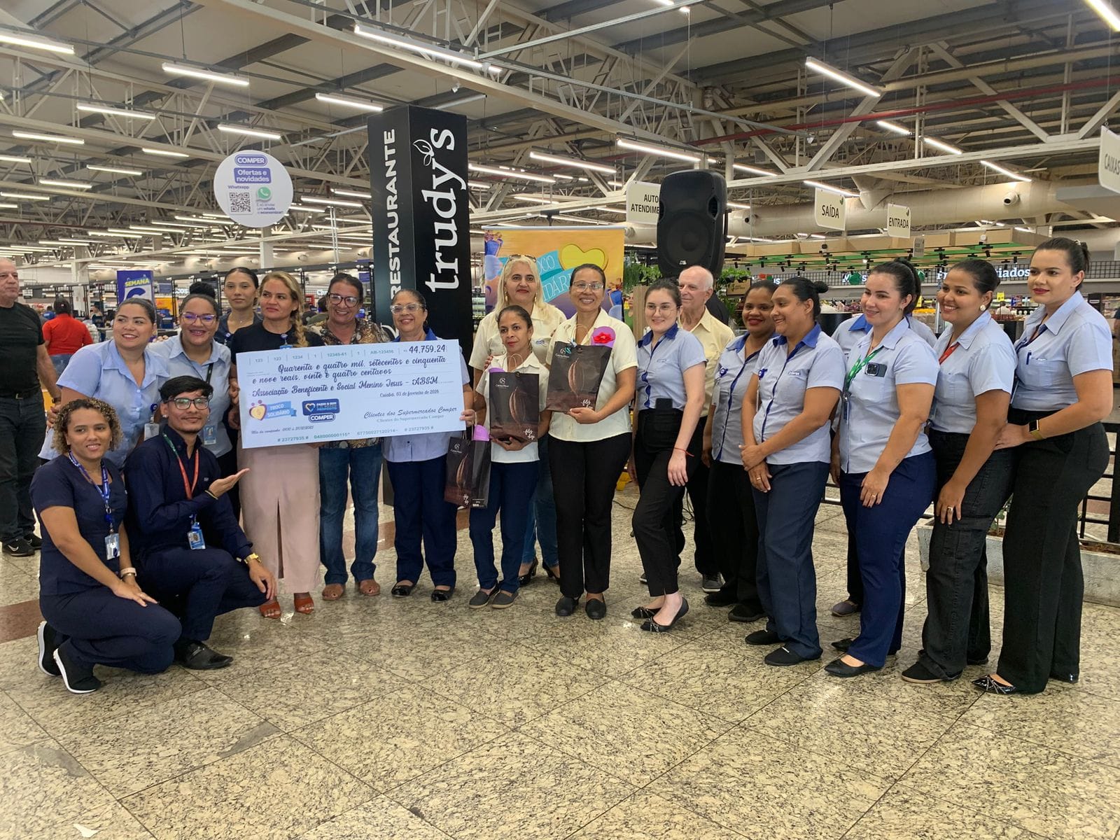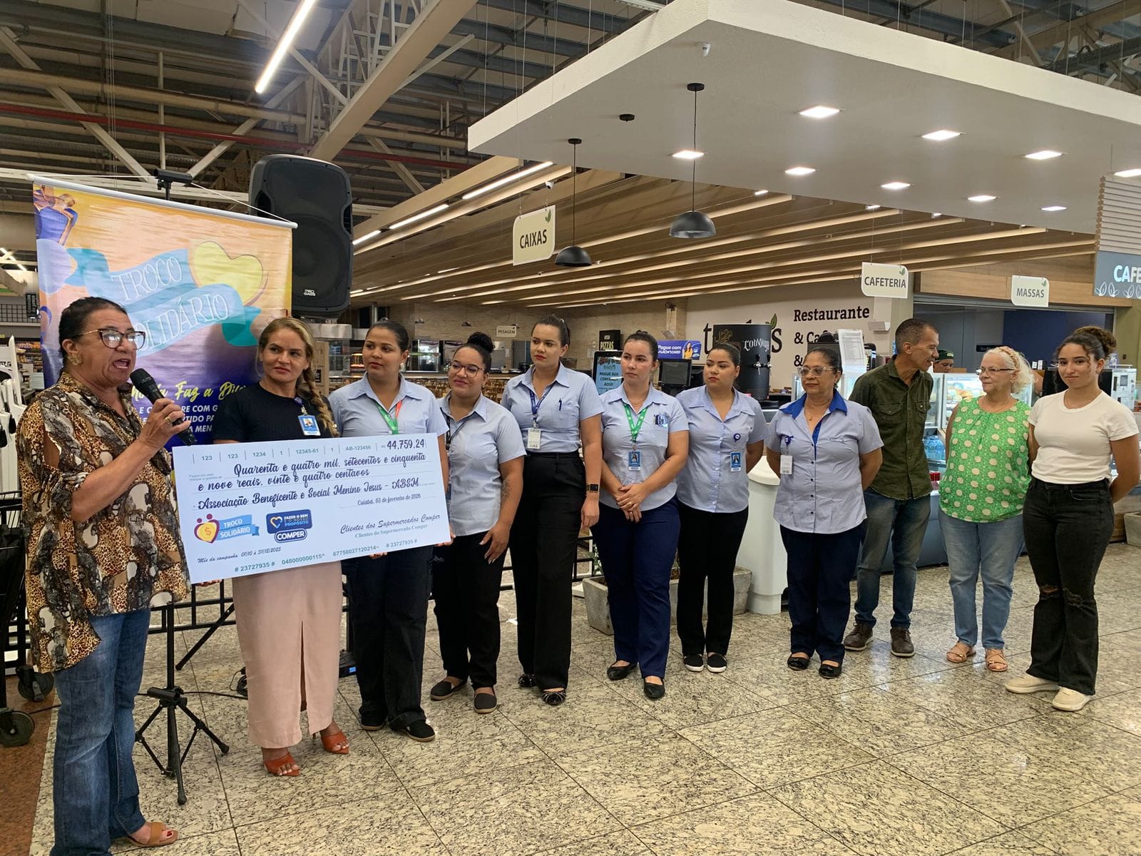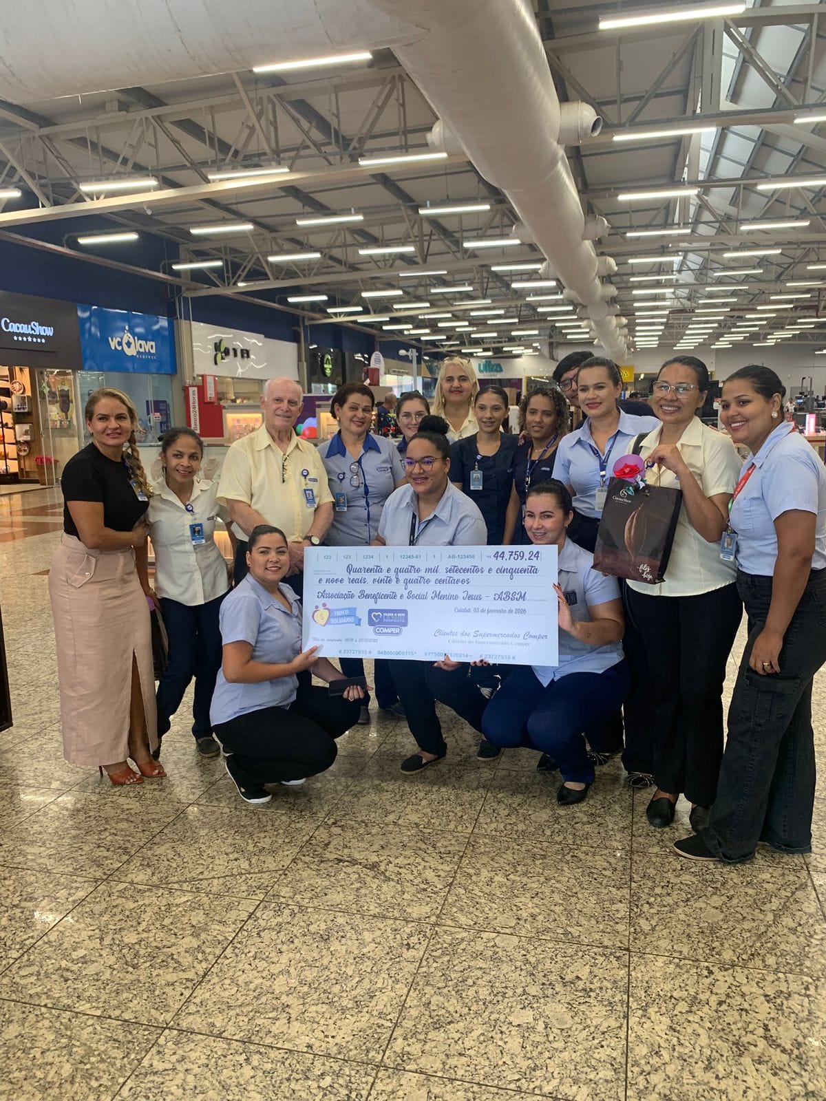 Assessoria - A entrega do primeiro Troco Solidário Comper de 2026 ocorreu na terça-feira (3) no Comper do CPAI e foi bastante prestigiada pelos representantes das instituições, funcionários, clientes e imprensa. A Associação Beneficente e Social Menino Jesus - ABSMJ recebeu a doação no valor de R$ 44.759,24 referente à arrecadação dos meses de outubro a dezembro de 2025.
