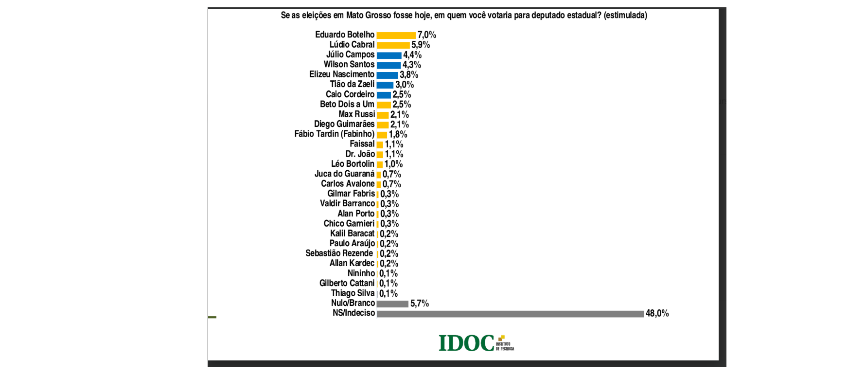 Levantamento presencial realizado pelo Instituto IDOC com 1.000 pessoas entre os dias 29 e 30 de novembro, e 1º de dezembro nas duas maiores cidades de Mato Grosso, Cuiabá e Várzea Grande, aponta o ex-presidente da Assembleia Legislativa, Eduardo Botelho (União), como líder isolado da sondagem com exatos 7% das intenções de voto para deputado estadual.