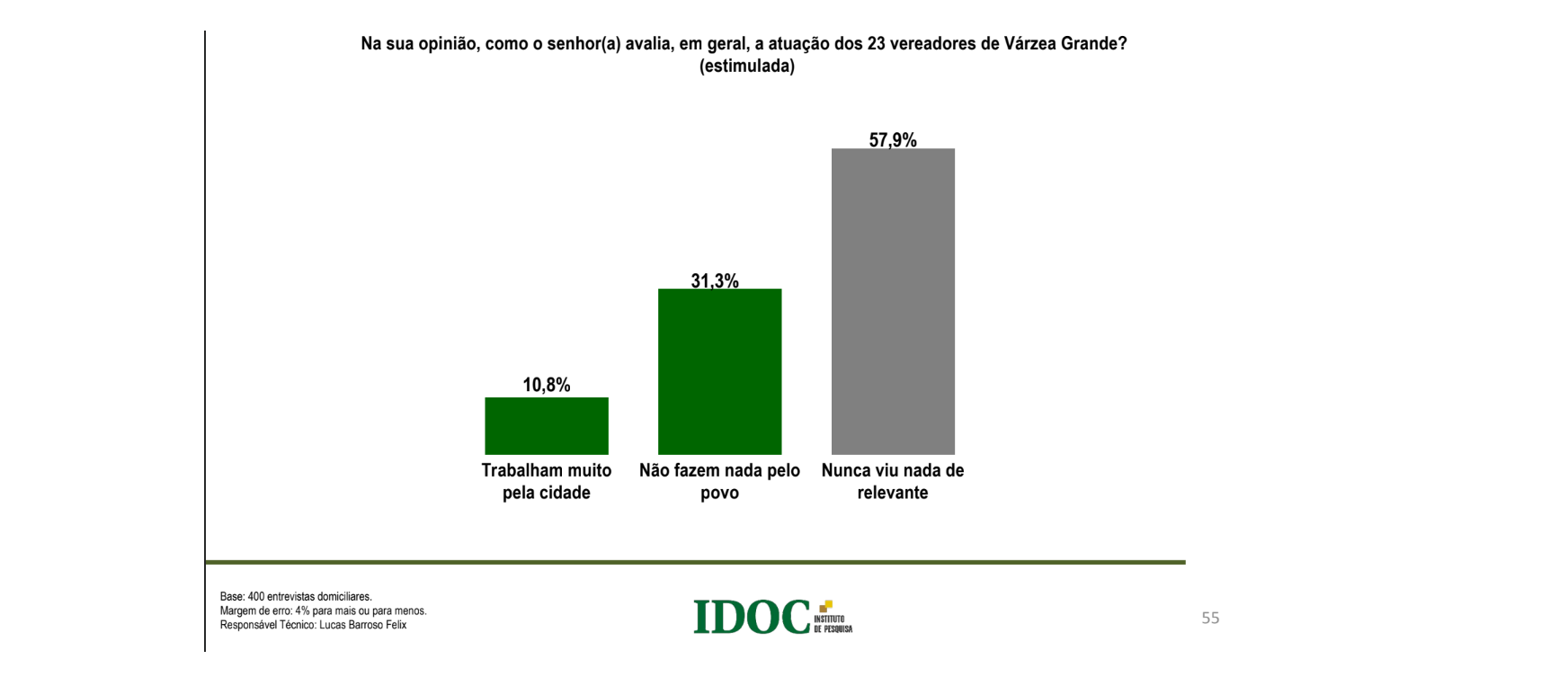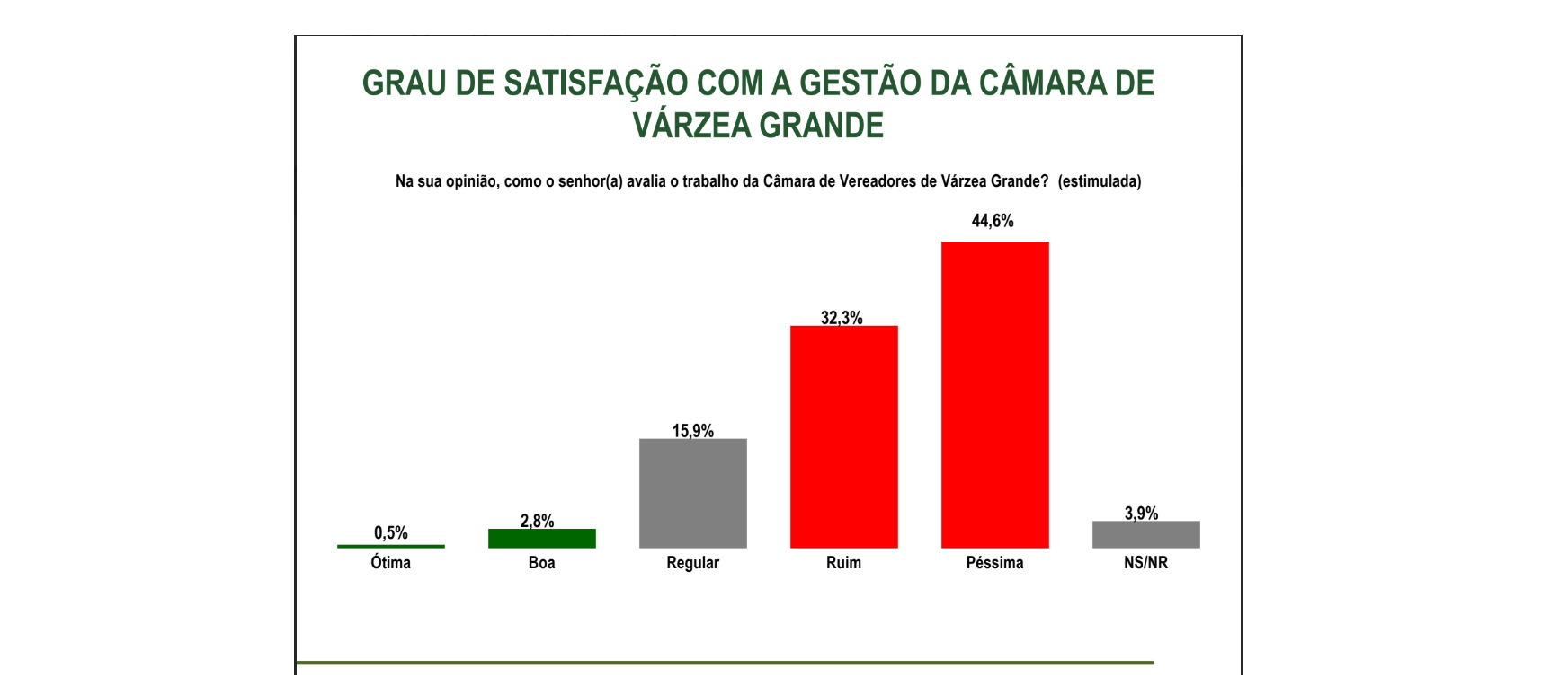 Pelo levantamento em campo, com 400 entrevistas presenciais, 77% das pessoas pesquisadas consideraram o trabalho da Casa de Leis local como ruim ou péssimo. 15,9% acharam regular, e apenas 3,3% disseram que a atuação dos 23 vereadores várzea-grandenses é boa ou ótima.