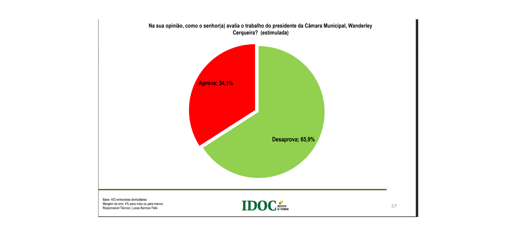 Na mesma esteira, o presidente da Casa de Leis, Wanderley Cerqueira (MDB), também está com a imagem pública muito debilitada. Pela sondagem, 65,9% desaprovam a gestão dele, enquanto 34,1% aprovam.