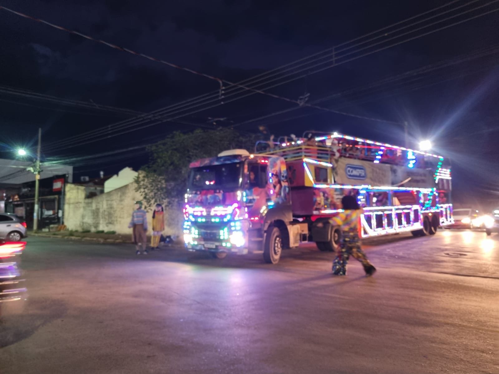O Papai Noel saiu da unidade do Comper de Várzea Grande, na Avenida Alzira Santana, e percorreu um trajeto de 16 km, até a loja do CPA I. Desta vez, o 'Bom Velhinho' deu folga às renas e pegou carona com a Carreta Furacão. O percurso foi animado, com música e dança até o CPA I.