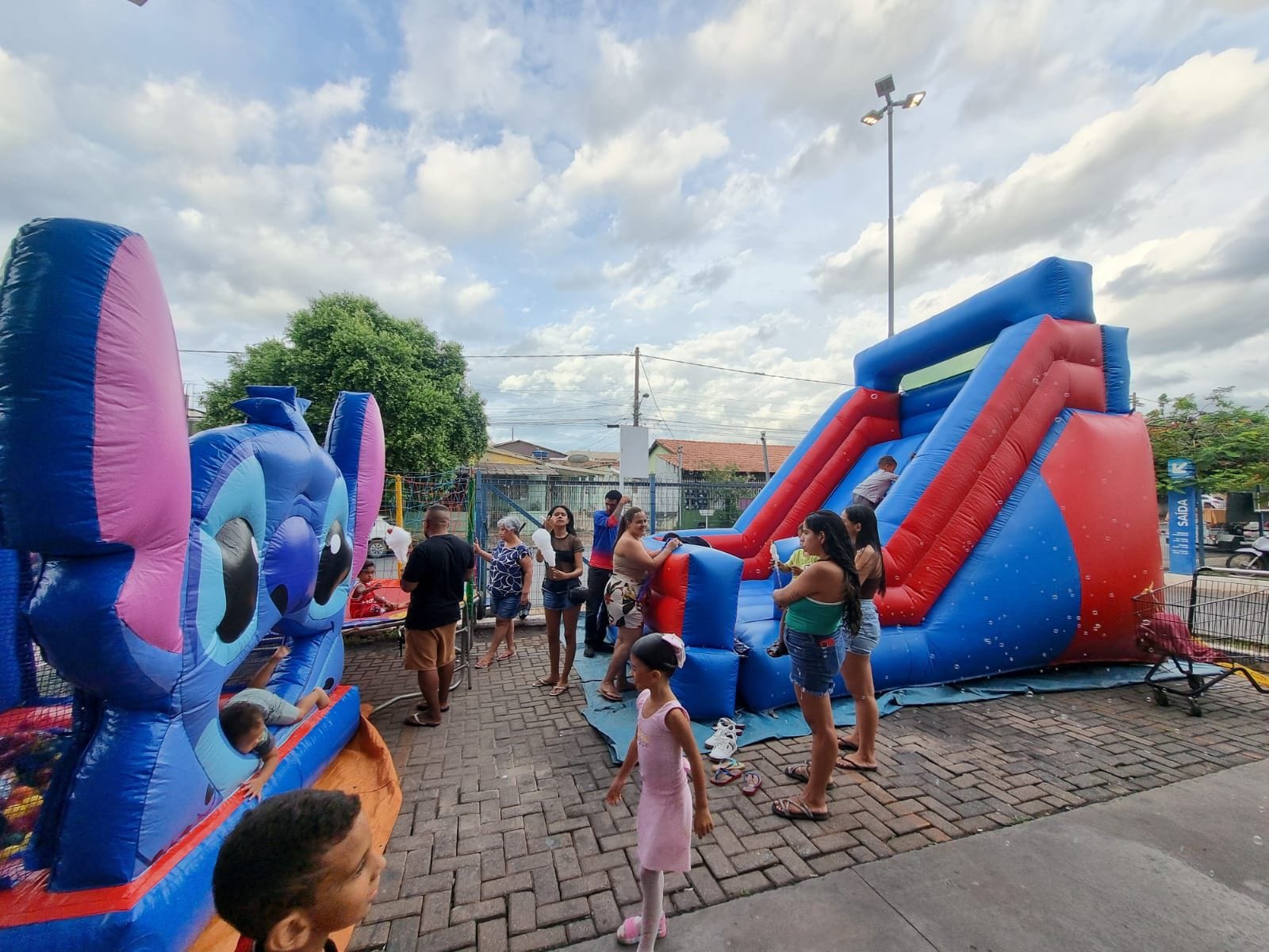 O estacionamento do Comper foi transformado em parque de diversões. As crianças puderam brincar gratuitamente no pula-pula, piscina de bolinha e castelo inflável.