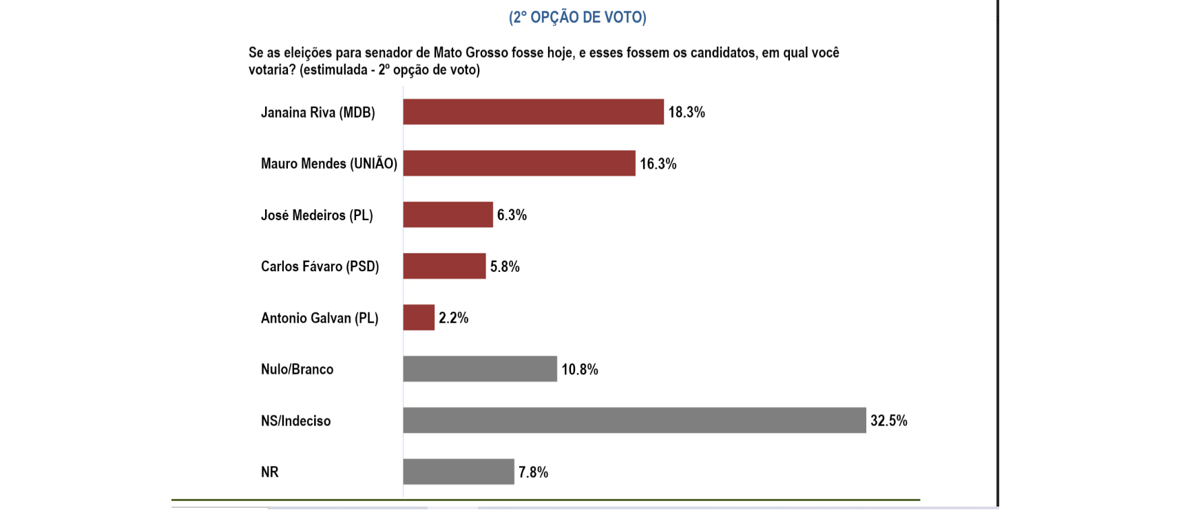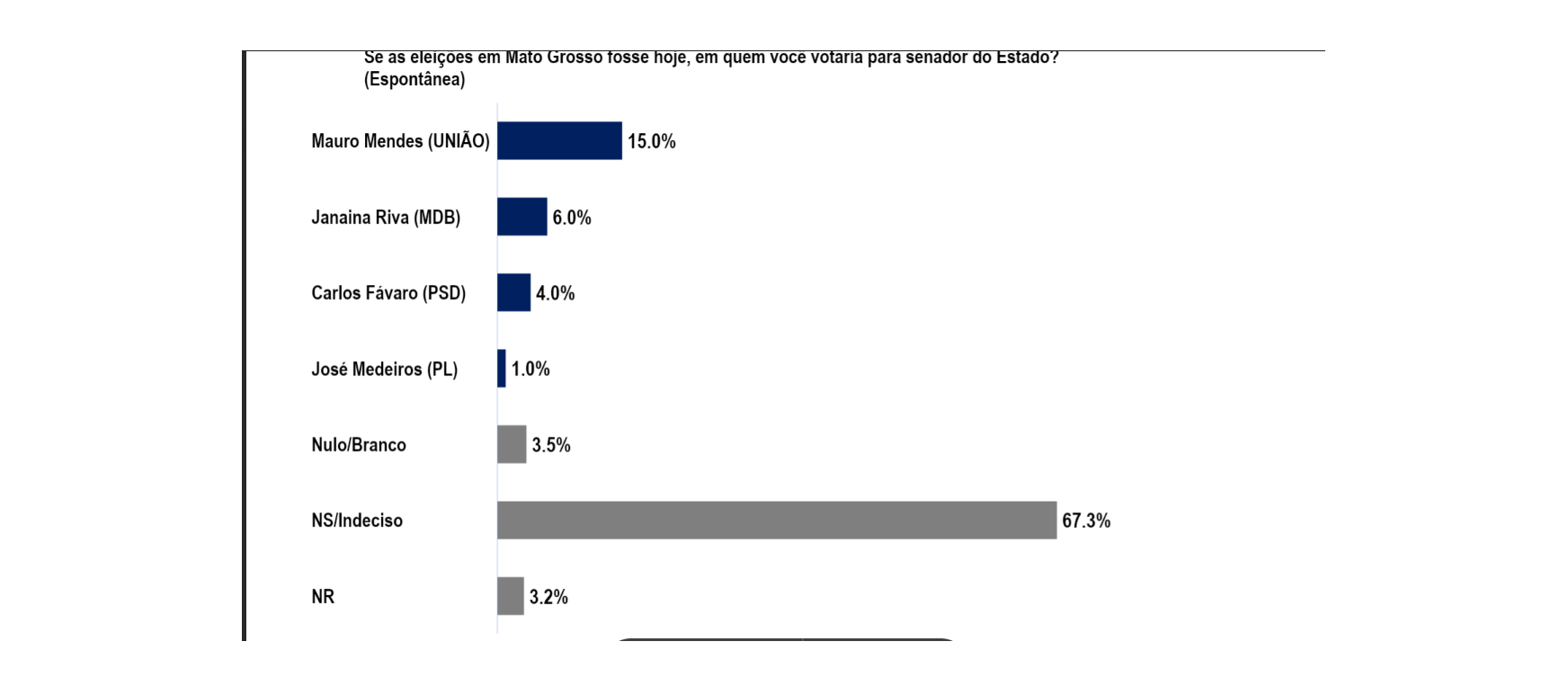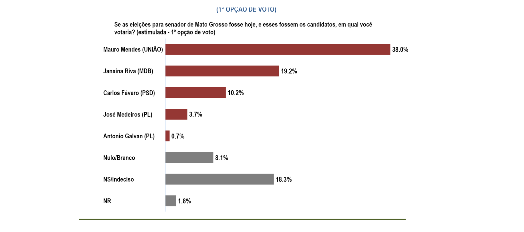Pesquisa realizada pelo Instituto IDOC em Cuiabá, com 600 pessoas, mostra Mauro Mendes com 38% das intenções de voto, quando é apresentada a primeira opção de voto ao Senado. A deputada estadual, Janaina Riva (MDB), é a segunda colocada com 19,2%.