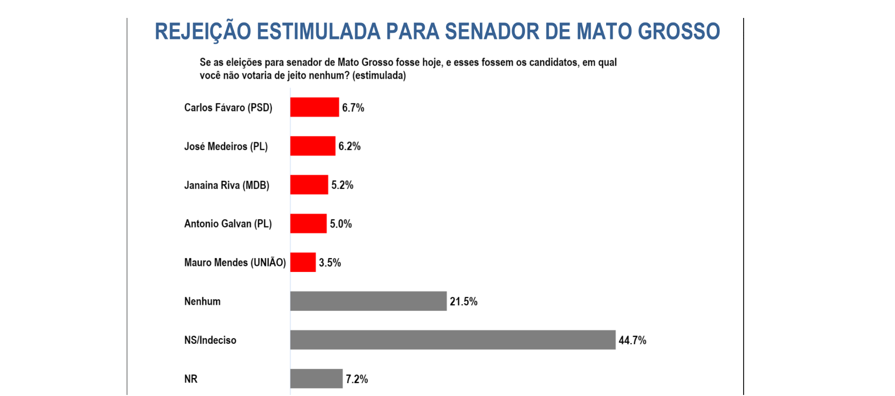 Três nomes estão empatados em se tratando de rejeição. São eles: Fávaro (6,7%), Medeiros (6,2%) e Janaina (5,2%). Mauro sofreu recusa de apenas 3,5% dos entrevistados.