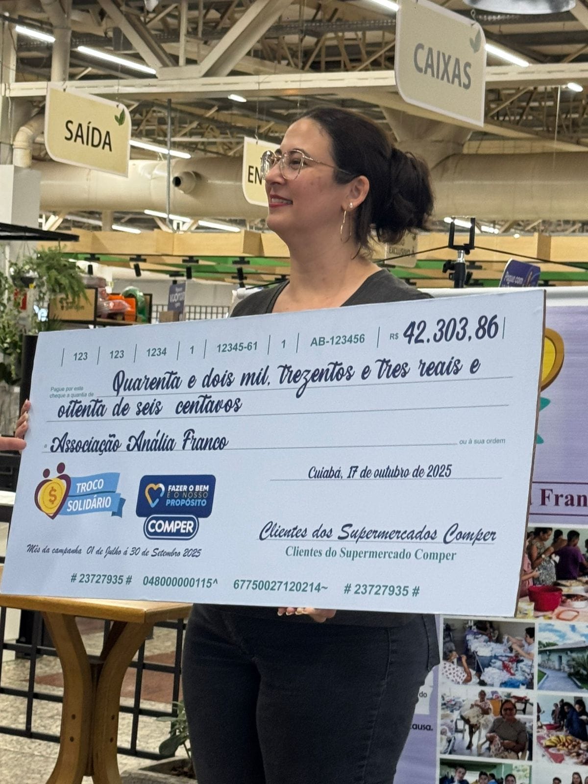 Assessoria - Na sexta-feira, 17 de outubro, a loja da Rede de Supermercados Comper, do CPA I, em Cuiabá-MT, foi novamente o espaço marcado pela emoção e gratidão. Ocorreu a entrega de mais uma edição do Troco Solidário, que arrecadou R$ 42.303,86, tendo como beneficiada a instituição Obras Sociais Anália Franco.