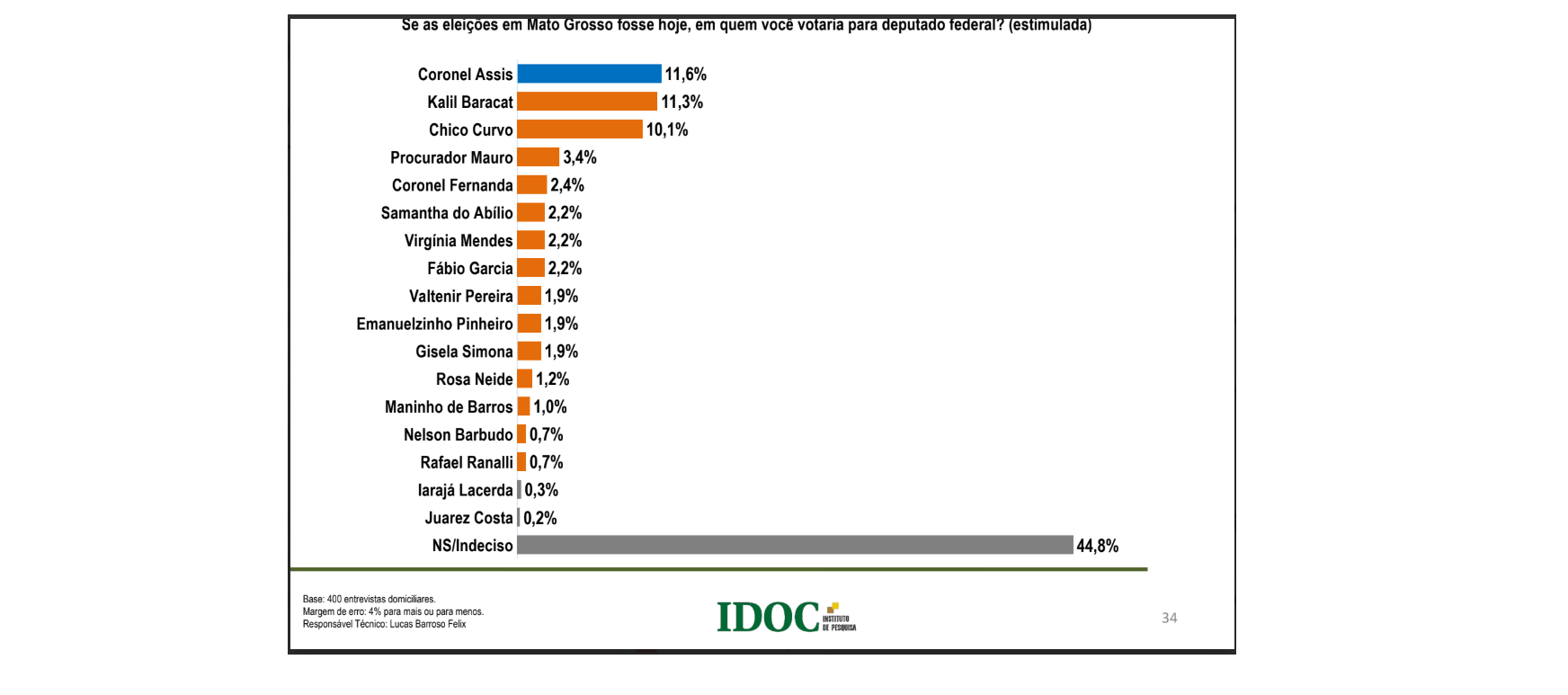 Na sequência, 9 prováveis concorrentes ao Congresso Nacional pontuaram com menos de 2% no IDOC: Valtenir Pereira, Emanuelzinho Pinheiro, Gisela Simona, Rosa Neide, Maninho de Barros, Nelson Barbudo, Rafael Ranalli, Irajá Lacerda e Juarez Costa.