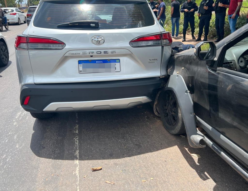 Diante da denúncia, as equipes realizaram diversas barreiras a fim de conter o motorista, que foi flagrado seguindo em direção ao Distrito Industrial. Na fuga, o homem bateu contra um carro Fiat Strada, preto. Na tentativa de conter o suspeito, os policiais efetuaram um disparo contra o veículo, abordando o homem em seguida.