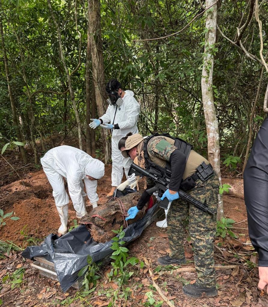 No ponto indicado, as equipes descobriram sinais de enterramentos clandestinos e localizaram dois corpos que ainda aguardam identificação.