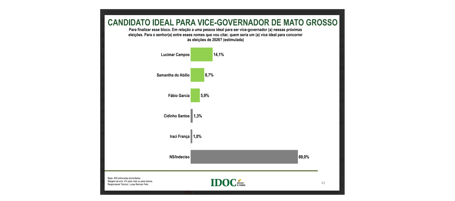 O Instituto IDOC, empresa ligada ao Portal O Documento e TV Cuiabá, mediu em Várzea Grande, segundo maior colégio eleitoral de Mato Grosso, qual seria o melhor nome para eventualmente concorrer ao cargo de vice-governador nas próximas eleições gerais.