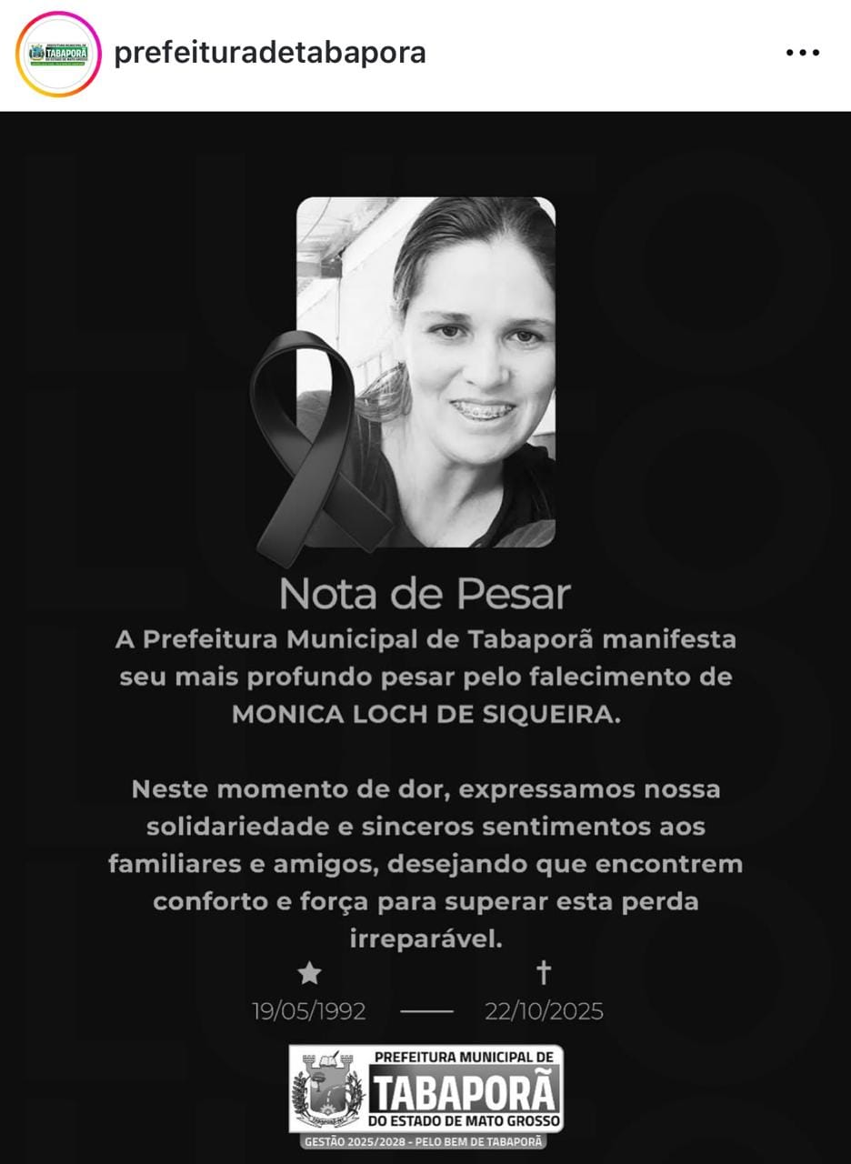 A vítima era empresária em Tabaporã. A Prefeitura Municipal publicou uma nota de pesar pela perda. “A Prefeitura Municipal de Tabaporã manifesta seu mais profundo pesar pelo falecimento de Monica Loch de Siqueira. Neste momento de dor, nos unimos aos familiares e amigos, expressando nossos mais sinceros sentimentos. Que encontrem conforto e força para enfrentar essa perda irreparável”, disse.