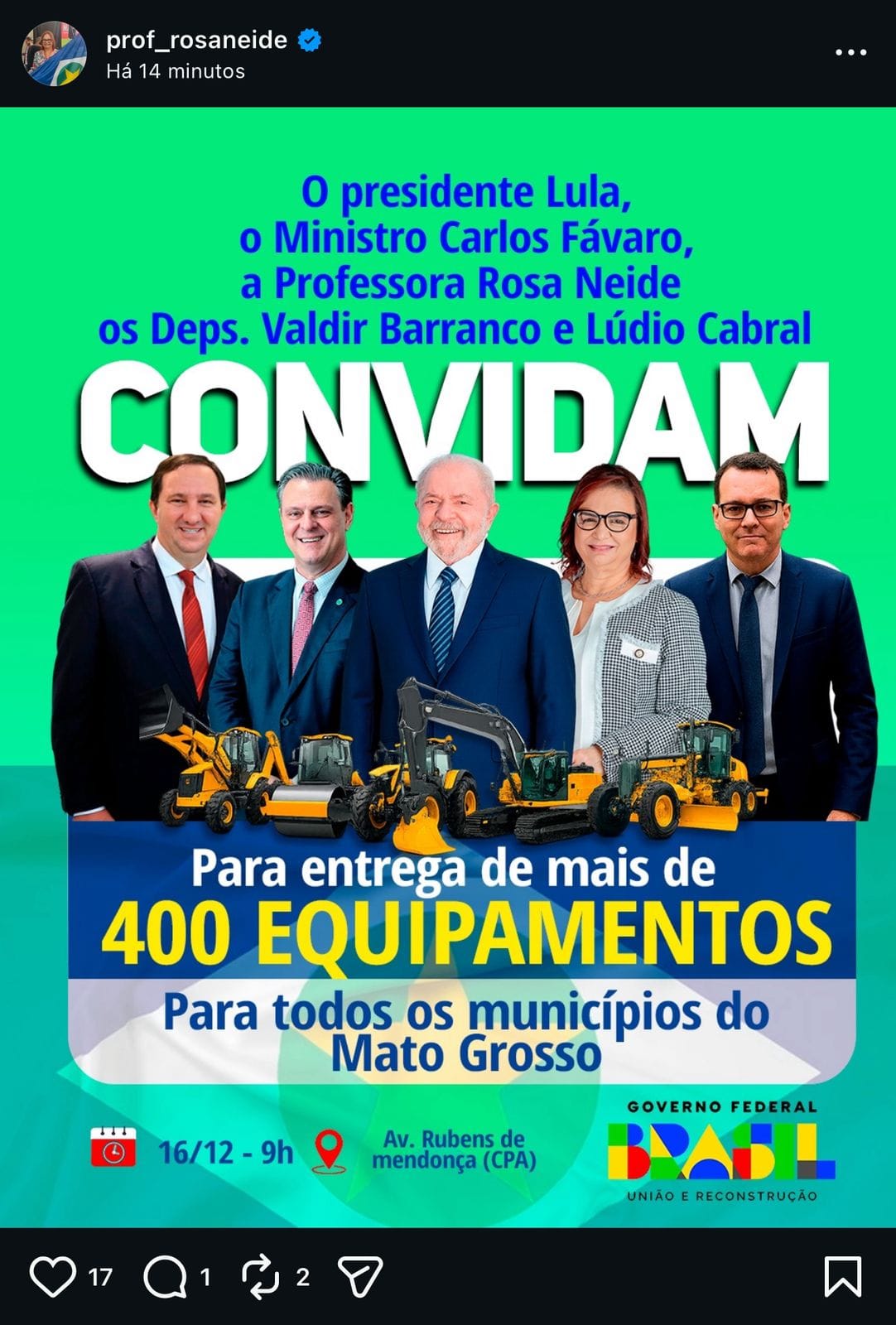 Conforme a postagem, “O presidente Lula, o ministro Carlos Fávaro, o deputado Valdir BArrando e a Professora Rosa Neide Convidam para a entrega de 400 equipamentos para todos os municípios de MT”.