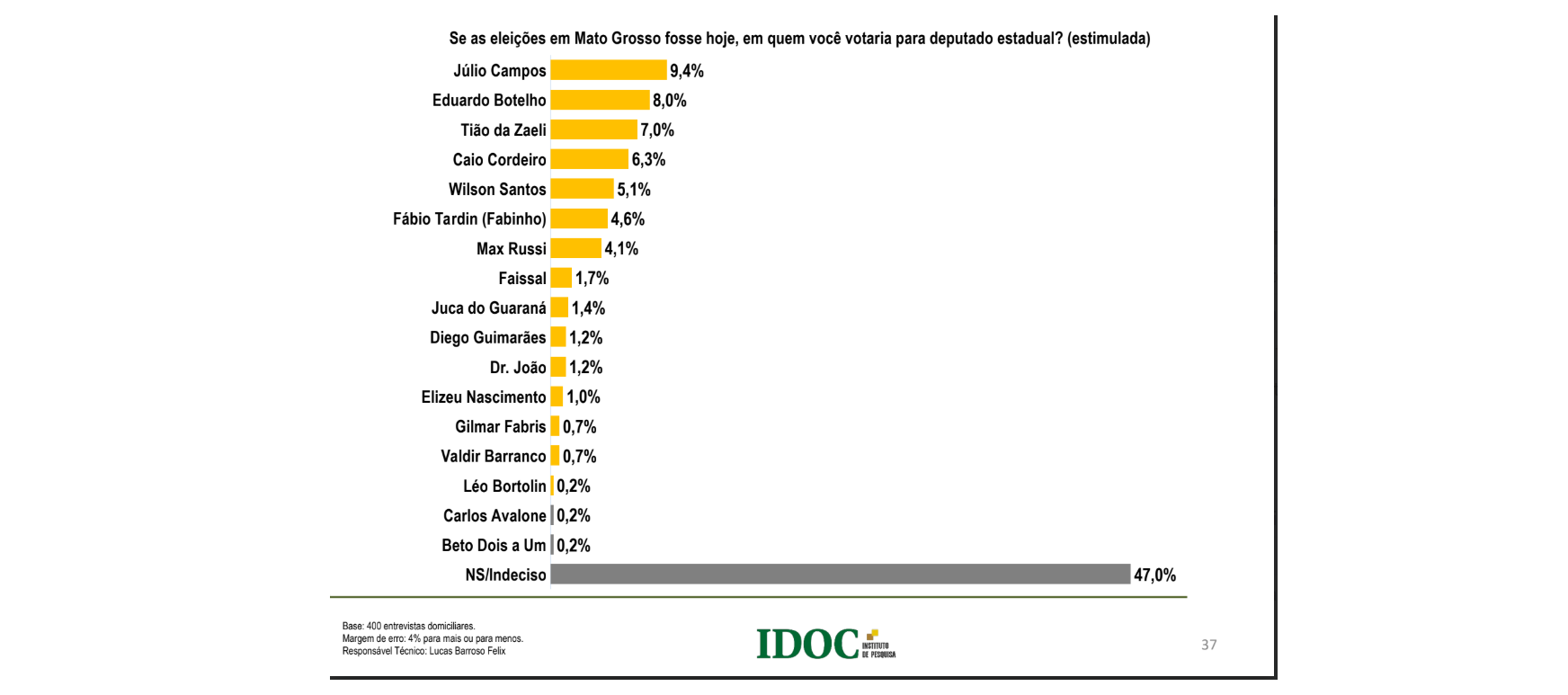 O IDOC detectou duas surpresas, em campo. A primeira foi a performance do vereador várzea-grandense, Caio Cordeiro (PL), que abocanhou 6,3%, número que pode lhe projetar com chances reais de conquistar cadeira na Assembleia Legislativa.