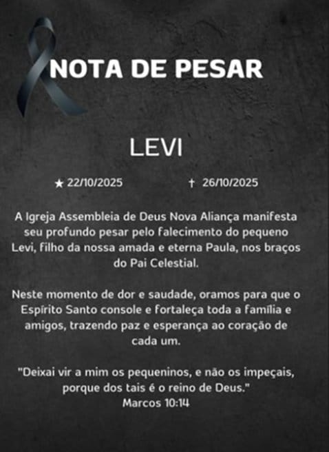 A notícia da morte do menino, chamado Levi, foi divulgada pela igreja frequentada por Paula, a Assembleia de Deus Nova Aliança, por meio das redes sociais. “Manifestamos nosso profundo pesar pelo falecimento do pequeno Levi, filho da nossa amada e eterna Paula, nos braços do Pai Celestial. Neste momento de dor e saudade, oramos para que o Espírito Santo console e fortaleça toda a família e amigos”, diz o comunicado publicado pela instituição.