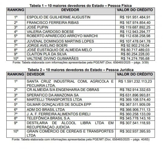 O relator também analisou duas listas apresentadas nos autos, sendo uma elaborada pela unidade técnica, com dados de maio de 2025, e outra enviada pela PGE, atualizada até setembro do mesmo ano. A comparação revelou divergências expressivas, principalmente no ranking das pessoas jurídicas.