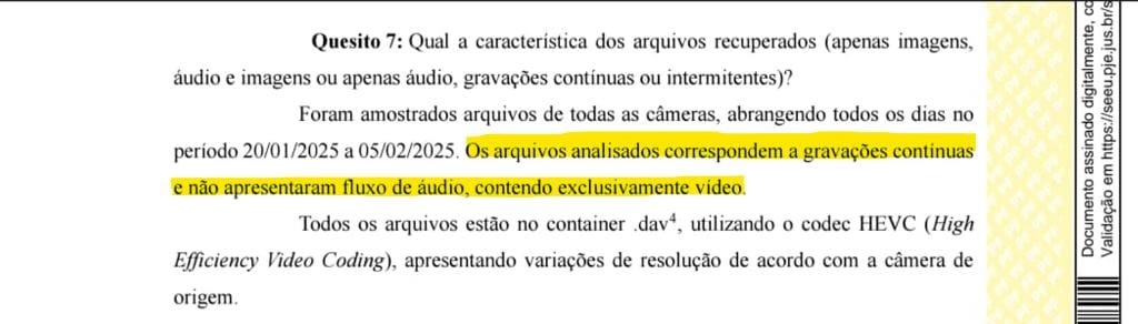 “Os arquivos analisados correspondem a gravações contínuas e não apresentaram fluxo de áudio, contendo exclusivamente vídeos”, concluiu a perícia que foi realizada pelo perito criminal Lenildo Correia da Silva Júnior.