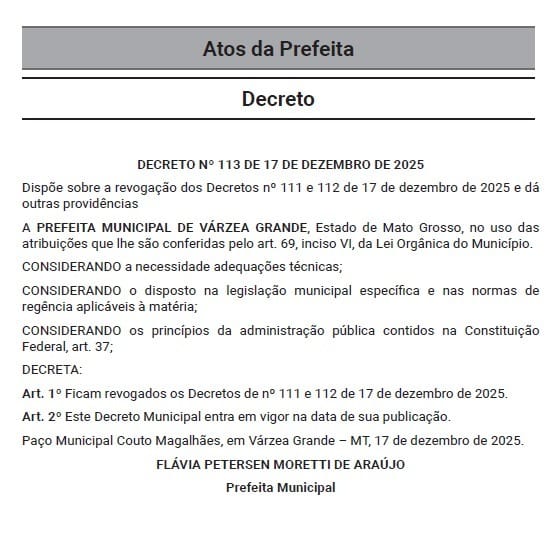 Segundo o decreto de revogamento, a decisão foi tomada diante da “necessidade de adequações técnicas”, sem detalhar quais pontos motivaram a mudança de posição do Executivo municipal. O texto determina a revogação imediata dos atos anteriores e estabelece que a nova norma entra em vigor na data da publicação .