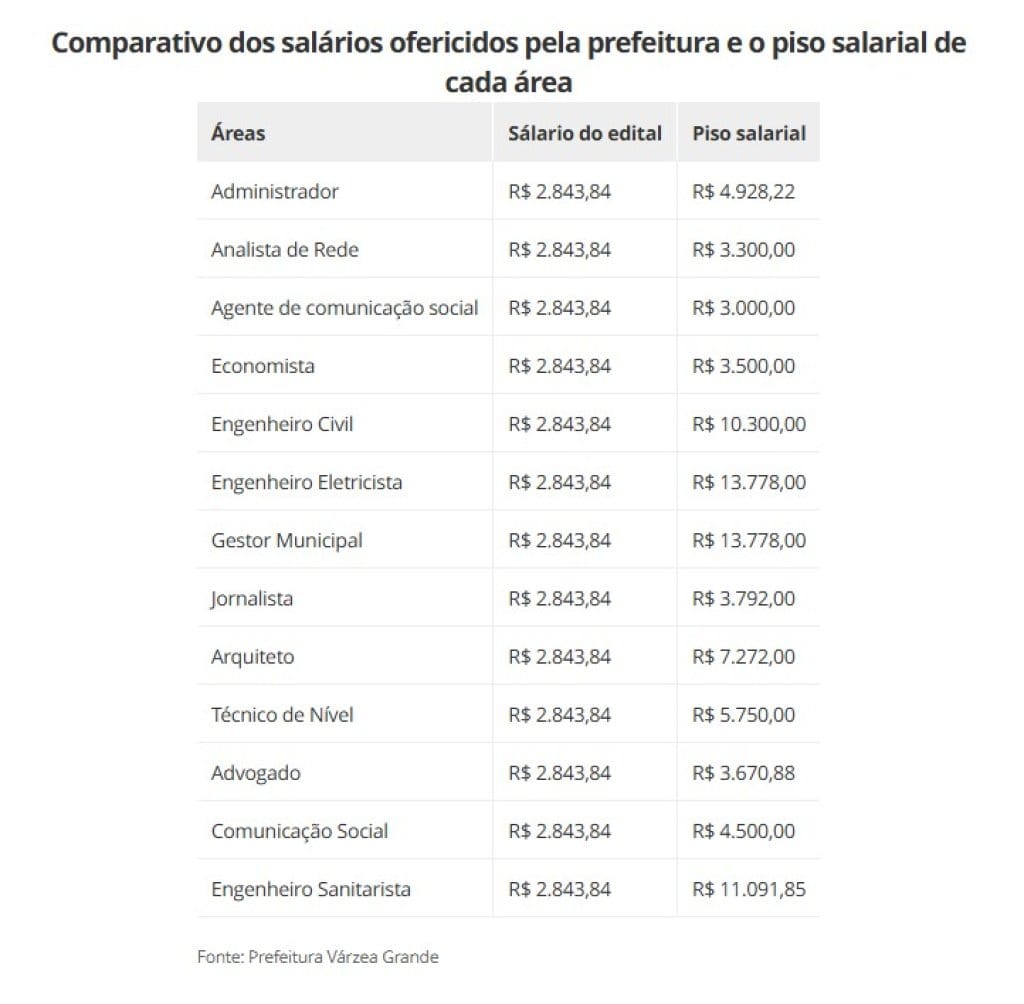 Ainda segundo a gestão, todas as áreas recebem o mesmo salário-base porque não são definidas pelo piso salarial de cada curso, mas estão vinculadas ao cargo de técnico de desenvolvimento social, diferenciando-se apenas pelas denominações.
