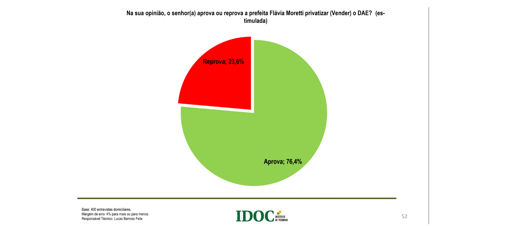Pesquisa realizada pelo Instituto IDOC, com 400 entrevistas presenciais, em Várzea Grande, revelou o apoio maciço dos mais de 300 mil moradores da cidade quando o assunto se trata da privatização ou “venda” do Departamento de Água e Esgoto (DAE).