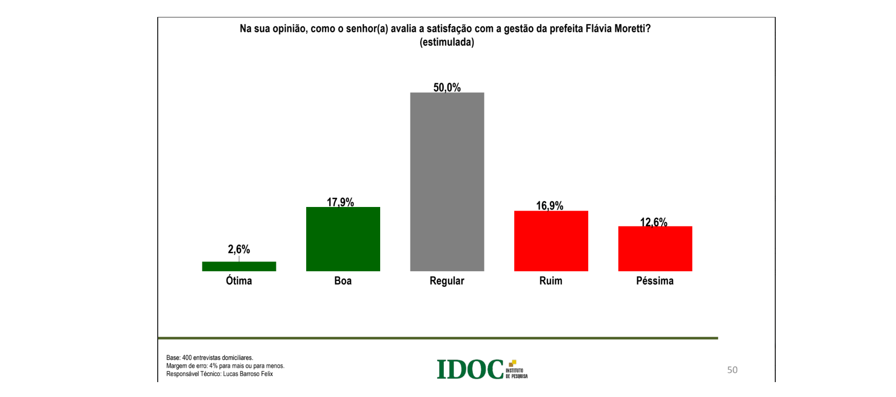 Pesquisa presencial, com 400 entrevistas, realizada pelo Instituto IDOC, mostrou com absoluta clareza que o eleitor de Várzea Grande continua com o propósito firme e inabalável de mudança conceitual nas urnas. Pelos números, a atual prefeita, Flávia Moretti (PL), tem 70% de aprovação entre ótimo, bom e regular. E mais: ela ostenta 60% de confiança junto ao eleitorado.