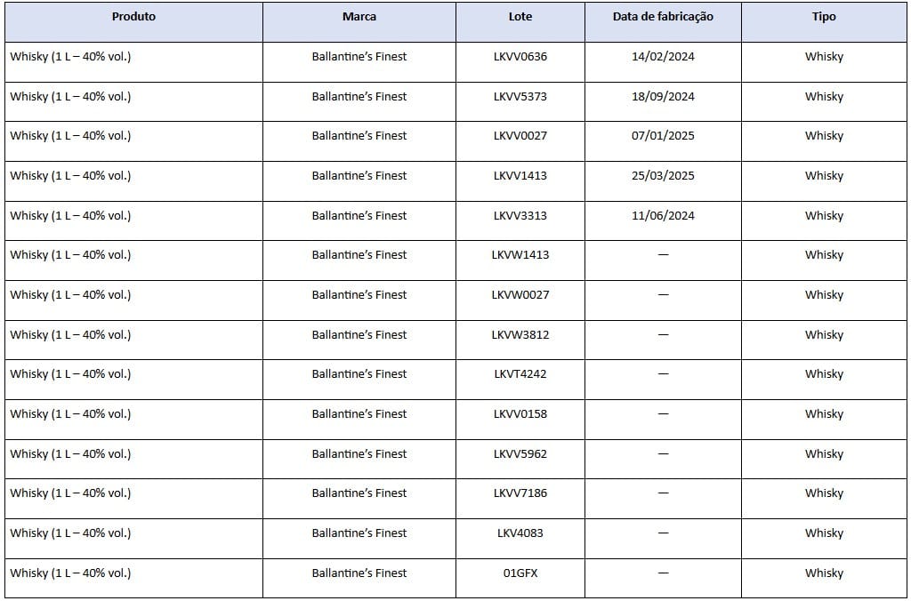 A Pernod Ricard Brasil, importadora oficial e detentora do registro da marca no país, enviou à Secretaria documentação que comprova a regularidade de fabricação, origem e importação de quatro lotes da lista (LKVV0636, LKVV5373, LKVW0027 e LKVW1413).