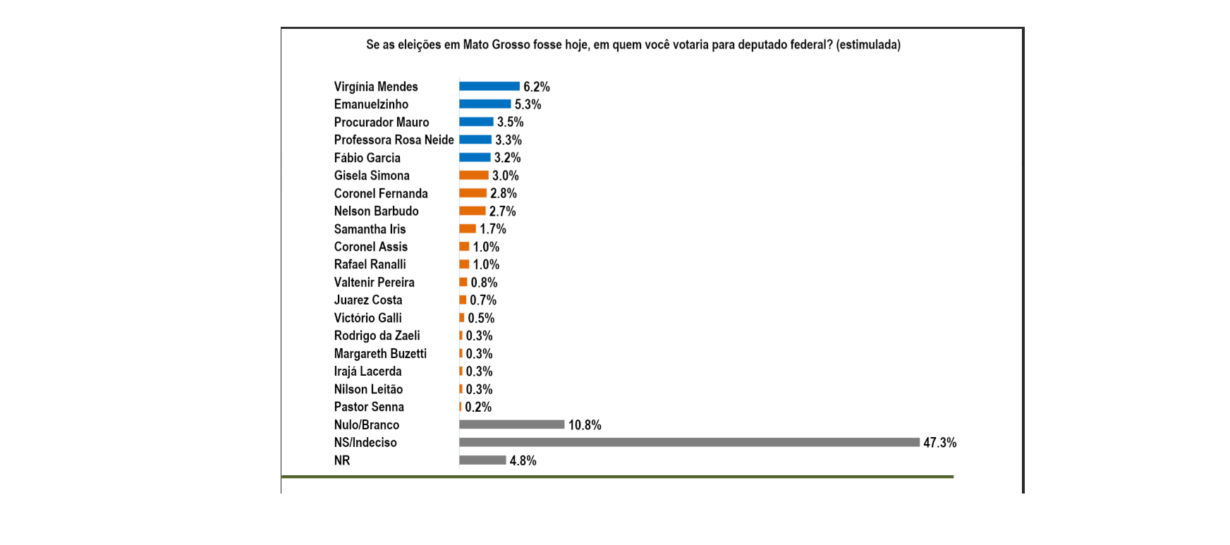 Pesquisa realizada pelo Instituto IDOC, com 600 pessoas, em Cuiabá, aponta a primeira-dama de Mato Grosso, Virgínia Mendes (União), na 1ª colocação com 6,2% das intenções de voto para deputada federal. Logo em seguida, Emanuelzinho Pinheiro (MDB), candidato à reeleição, cravou 5,3% de preferência popular.